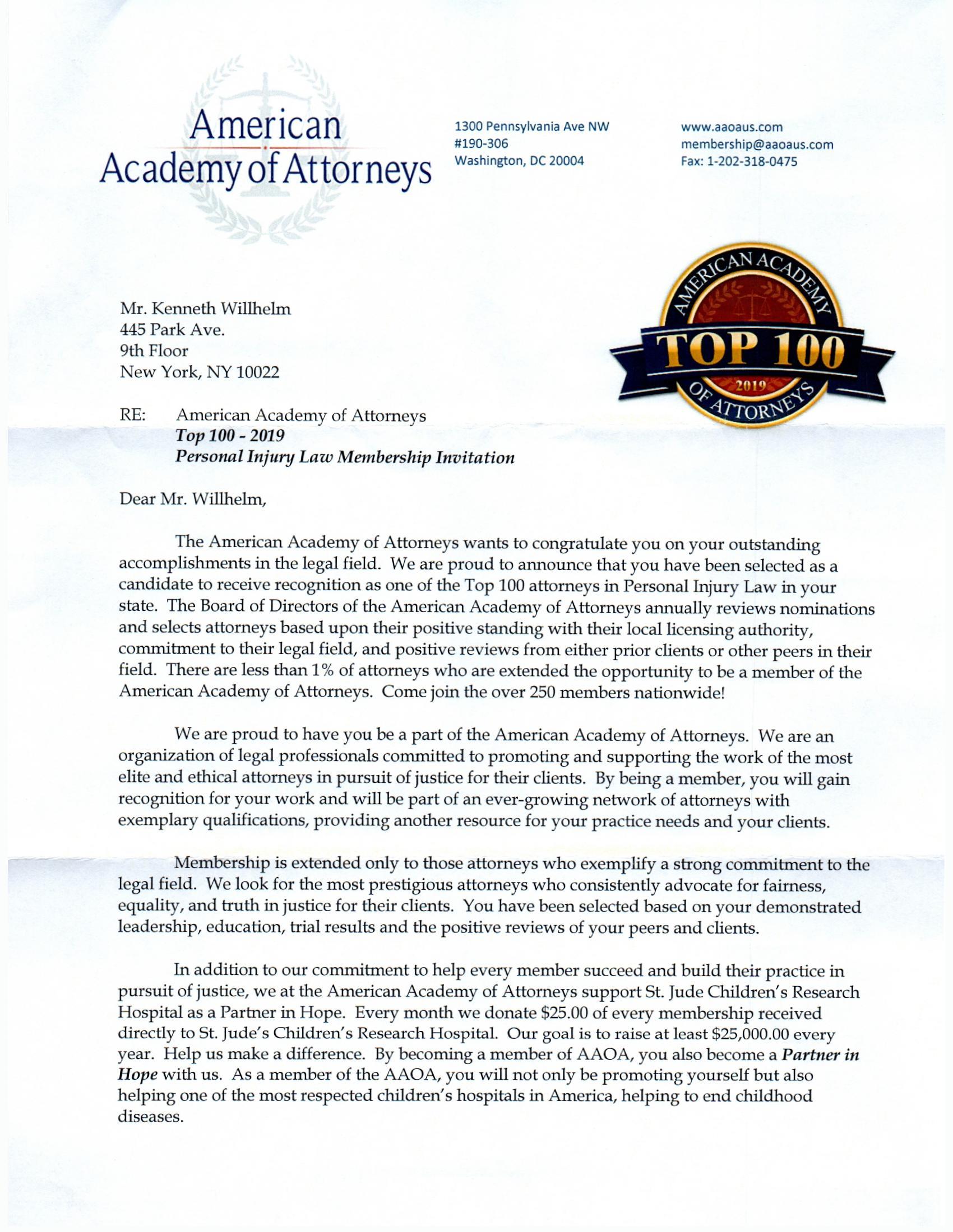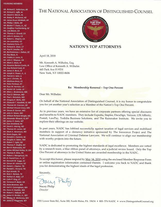 New York attorney Kenneth Wilhelm is an invited member into The National Trial Lawyers: Top 100 Trial Lawyers. His qualifications as one of New York’s top trial lawyers have earned him this prestigious invitation.
