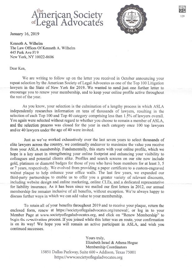 New York attorney Kenneth Wilhelm is an invited member into ASLA Top Litigation Lawyers. His qualifications as one of New York’s top trial lawyers have earned him this prestigious invitation.