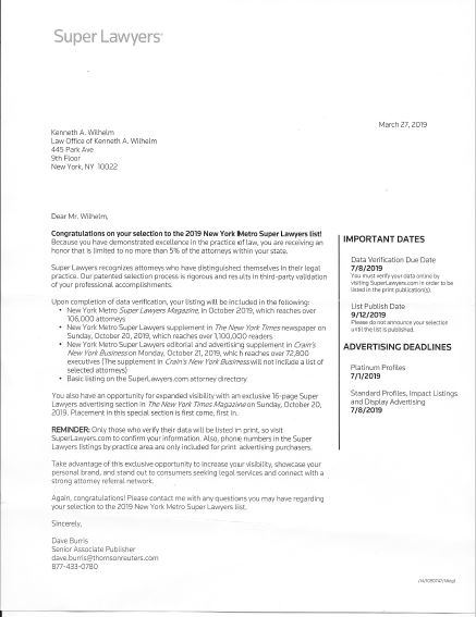 The Law Offices of Kenneth A. Wilhelm is pleased to announce that Mr. Wilhelm has again been named to the Super Lawyers list for the years 2014 to 2022 and this is “an honor that is limited to no more than 5% of the attorneys in the New York state.”
